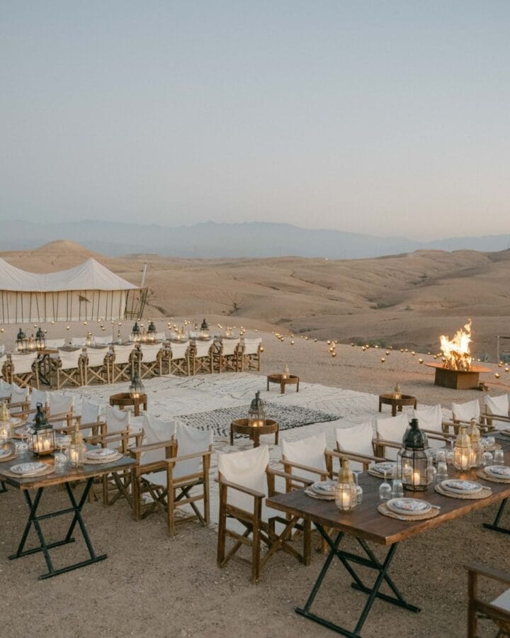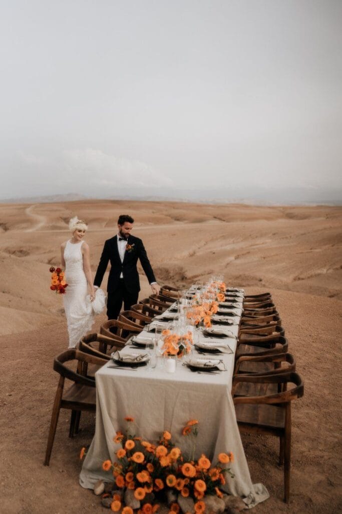 Si vous rêvez d’un cadre plus sauvage, le désert d’Agafay est parfait pour un mariage intime au Maroc. Les dunes dorées, les ciels infinis et le calme absolu permettent une immersion totale dans votre histoire. Le coucher de soleil crée une atmosphère irréelle, où chaque émotion est amplifiée et chaque regard devient mémorable.