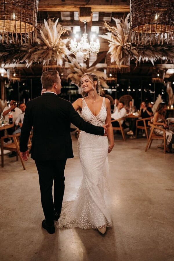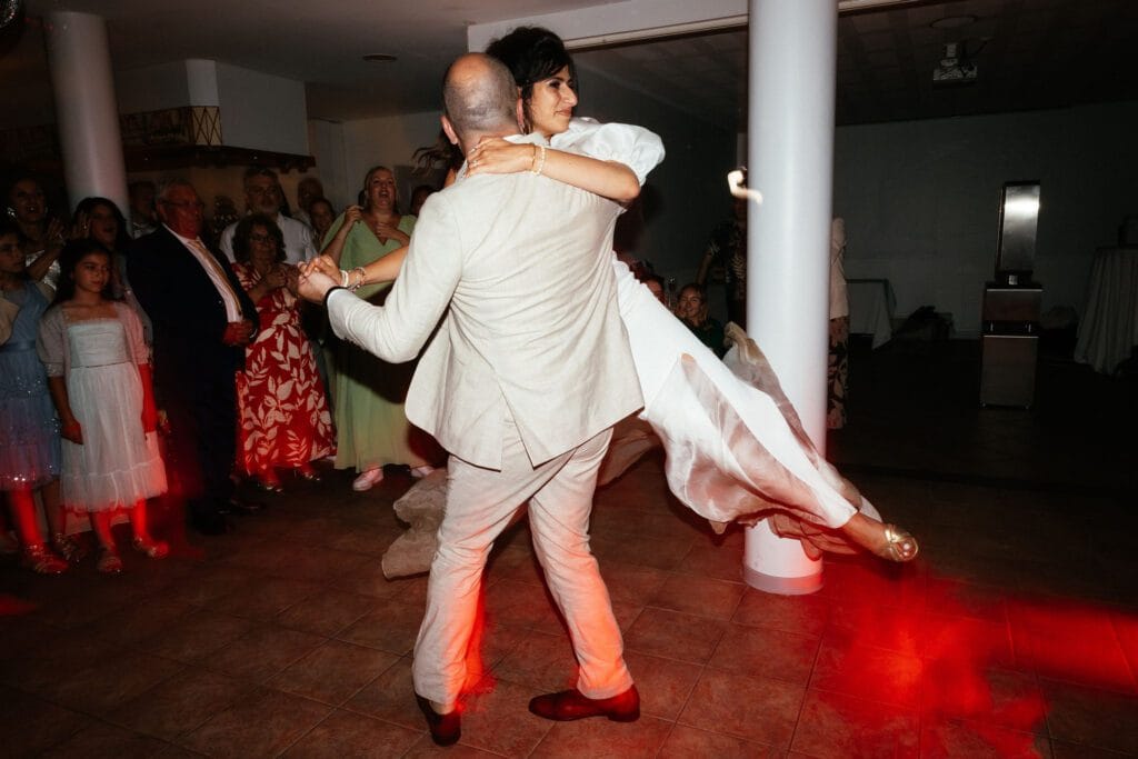 Pour certains mariages bohèmes, les couples choisissent de finir la danse sur un tour improvisé et un final très dynamique pour lancer la fête, surprenant tout le monde et déclenchant des applaudissements.